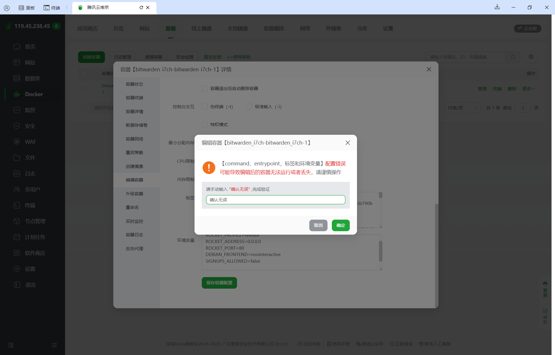 点击保存容器配置,输入确认无误完成验证,等待刷新,刷新完成后会自动运行容器