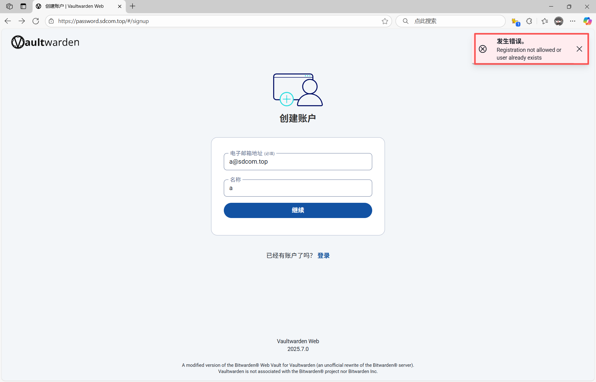 此时我们再次尝试注册,出现这个提示的时候就是已经关闭了验证