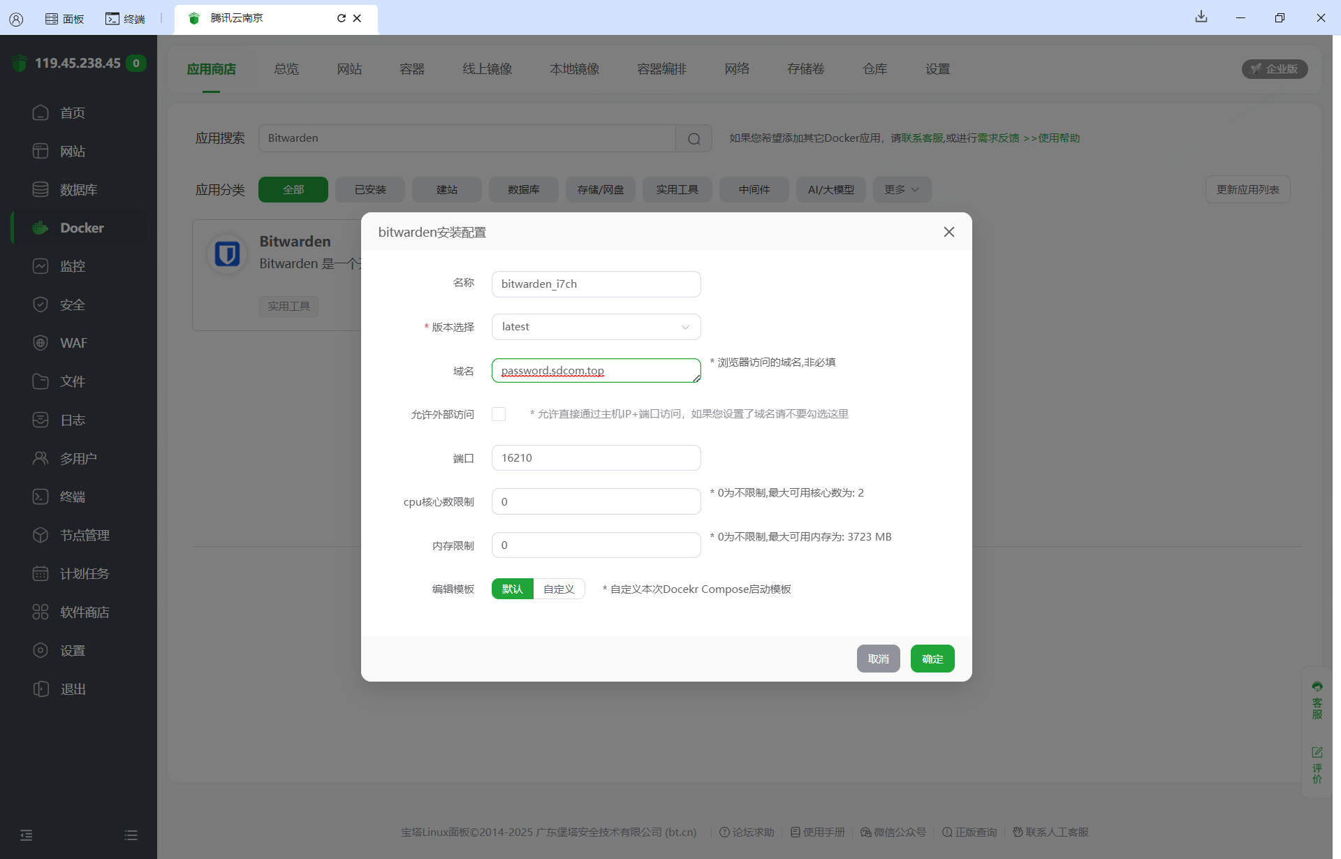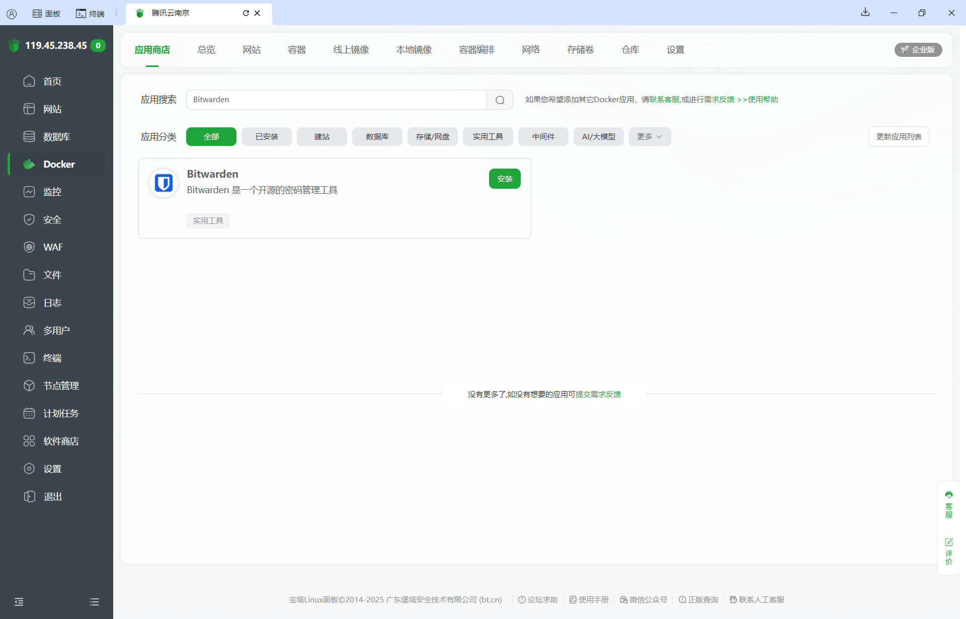 进入宝塔面板的Docker应用商店页面搜索Bitwarden